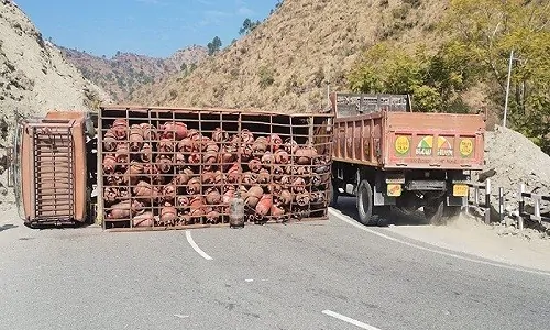 जानकारी के मुताबिक, मंगलवार सुबह सुयालबाड़ी व खीनापानी के बीच करतियागाड़ पुल पर एक गैस सिलेंडरों से लदा ट्रक संख्या UK04CB3124 अनियंत्रित होकर सड़क पर ही पलट गया।