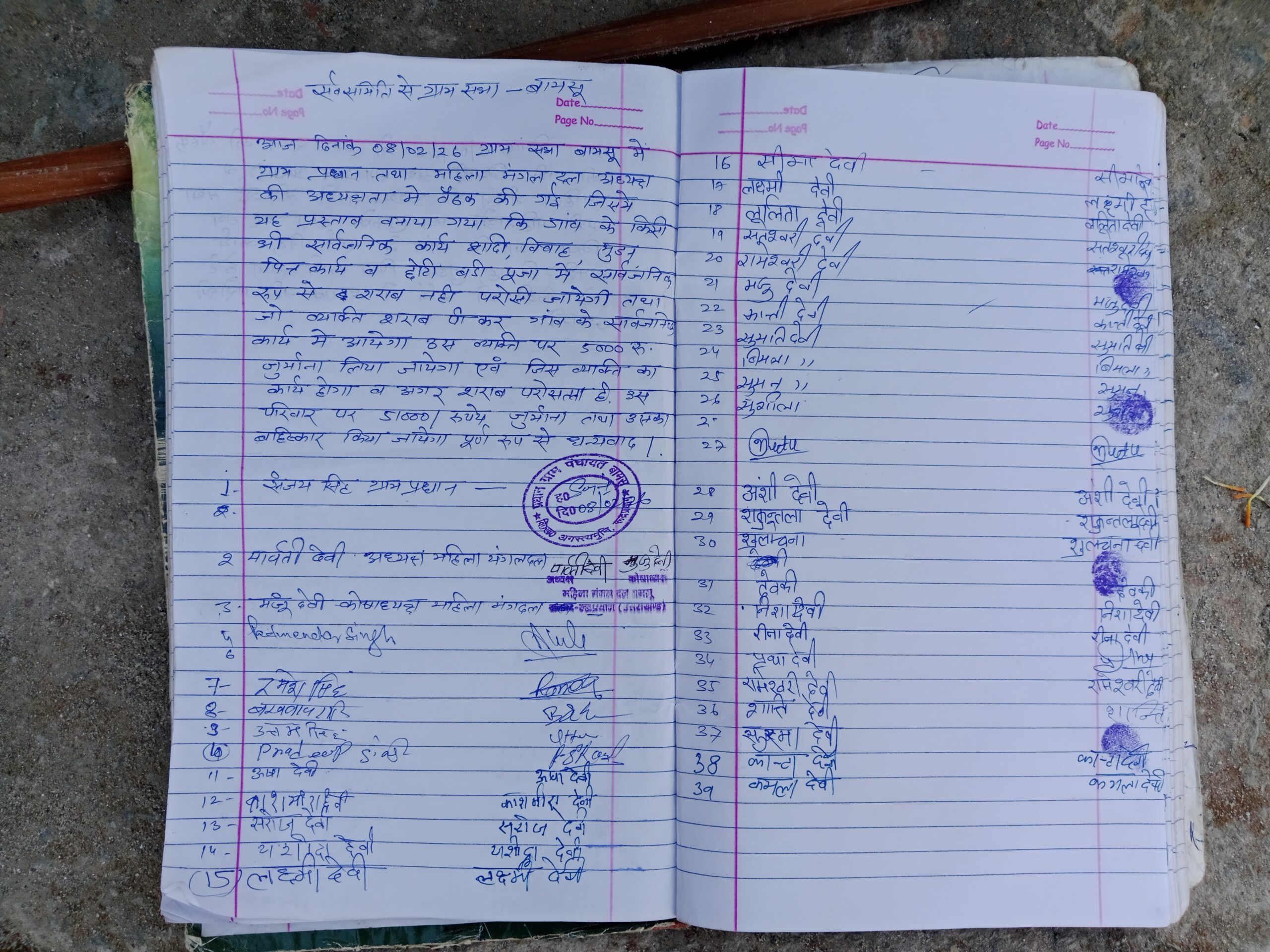 सुमन देवी, सुशीला देवी, अंशी देवी, सापुतारा देवी, सुलोचना देवी, निशा, रीना, रीता देवी, शांति, सुषमा, कांता, कमला सहित अनेक ग्रामवासियों ने इस सामाजिक संकल्प पर सहमति व्यक्त की।