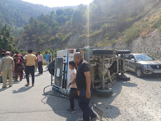 टिहरी, कांडीखाल में सड़क पर पलटी गाड़ी