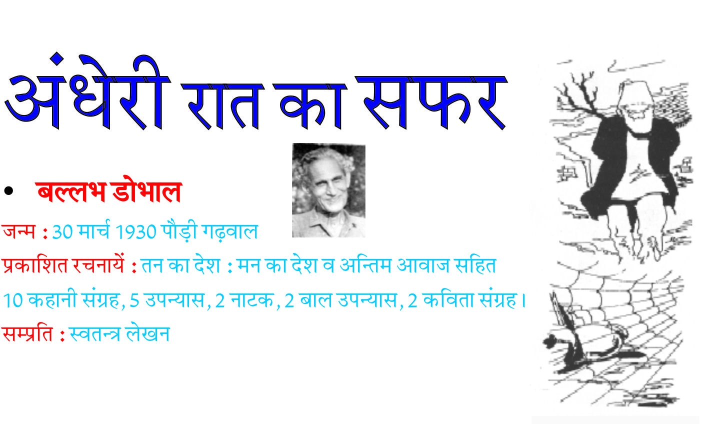 बल्लभ डोभाल हिन्दी कहानी के सशक्त हस्ताक्षर बल्लभ डोभाल का जन्म 30 मार्च, 1930 को हुआ। अंधेरी रात का सफर…