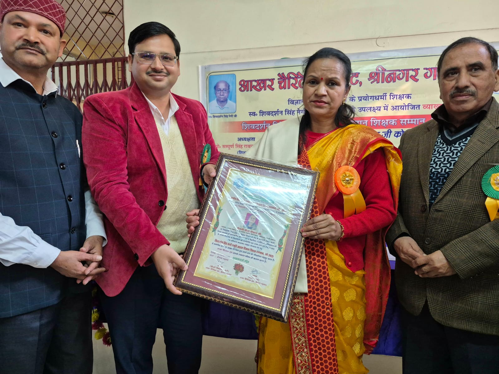 आखर चैरिटेबल ट्रस्ट की ओर से बीते पांच वर्षों से स्व. शिवदर्शन सिंह नेगी की स्मृति में गणित/विज्ञान शिक्षण के लिए प्रयोगधर्मी शिक्षकों के सम्मान की श्रृंखला में रविवार, 23 नवम्बर को राइंका जखण्ड की विज्ञान प्रवक्ता गीता चौहान को सम्मानित किया गया।