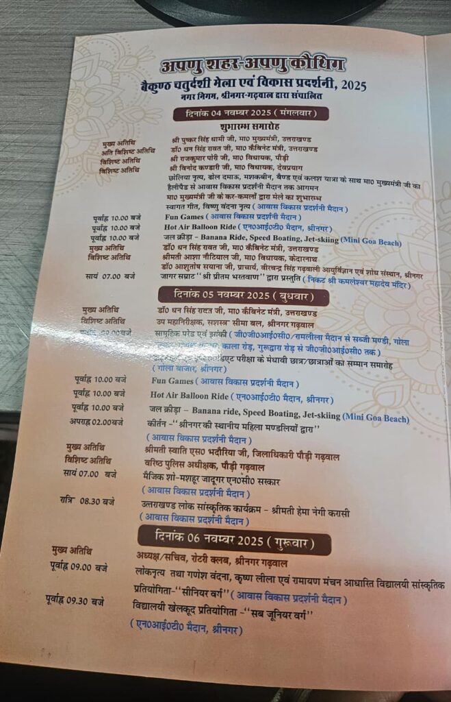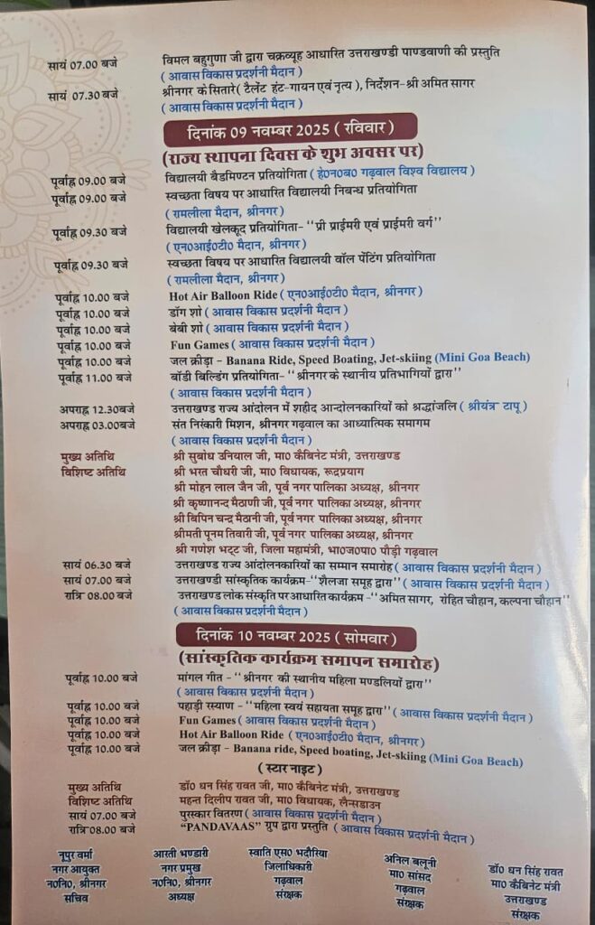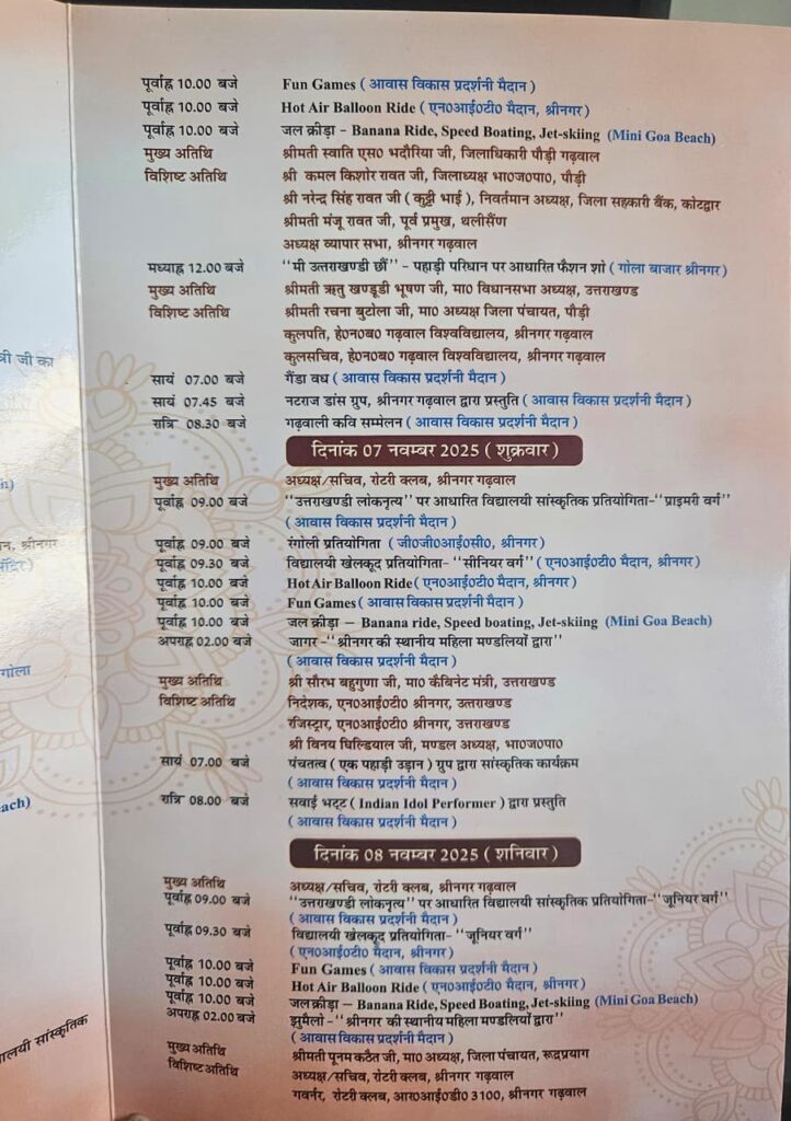 07 नवम्बर 2025 को उत्तराखण्डी लोकनृत्य पर आधारित विद्यालयी सांस्कृतिक प्रतियोगिता -प्राइमरी वर्ग (आवास विकास प्रदर्शनी मैदान), रंगोली प्रतियोगिता (जी०जी०आई०सी०, श्रीनगर), विद्यालयी खेलकूद प्रतियोगिता सीनियर वर्ग (एन०आई०टी० मैदान, श्रीनगर), श्रीनगर की स्थानीय महिला मण्डलियों द्वारा जागर (आवास विकास प्रदर्शनी मैदान), पंचतत्व (एक पहाड़ी उड़ान) ग्रुप द्वारा सांस्कृतिक कार्यक्रम (आवास विकास प्रदर्शनी मैदान), रात्रि को सवाई भट्ट (इंडियन आइडल परफोरमर) (आवास विकास प्रदर्शनी मैदान) में होगा।
