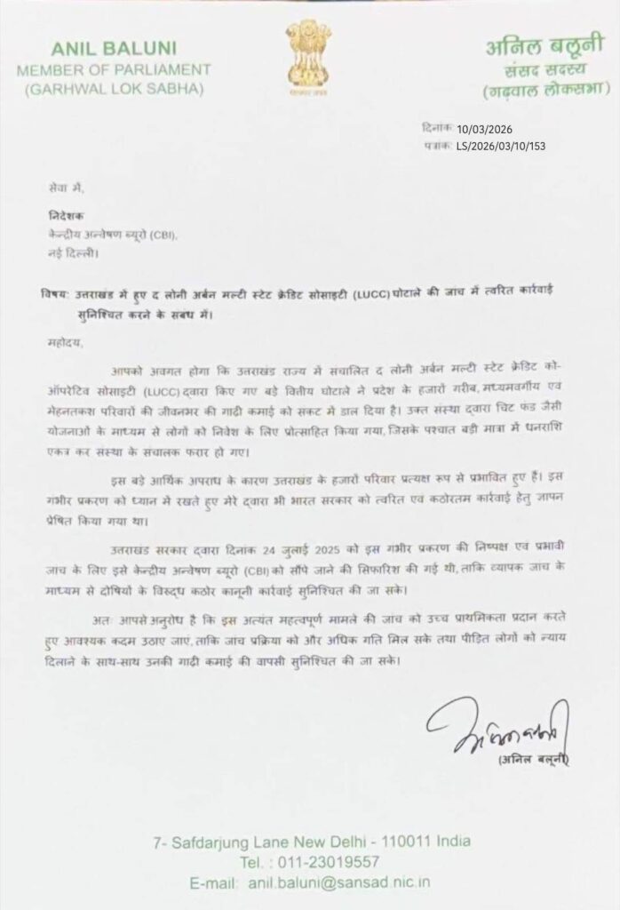 अपनी बात के पक्के अनिल बलूनी जी ने अब CBI को पत्र भेजकर इस मामले में हस्तक्षेप करने को कहा है। उन्होंने स्पष्ट किया है कि प्रदेश के हजारों गरीब और मध्यमवर्गीय परिवारों की मेहनत की कमाई डकारने वाले फरार संचालकों को बख्शा नहीं जाना चाहिए।