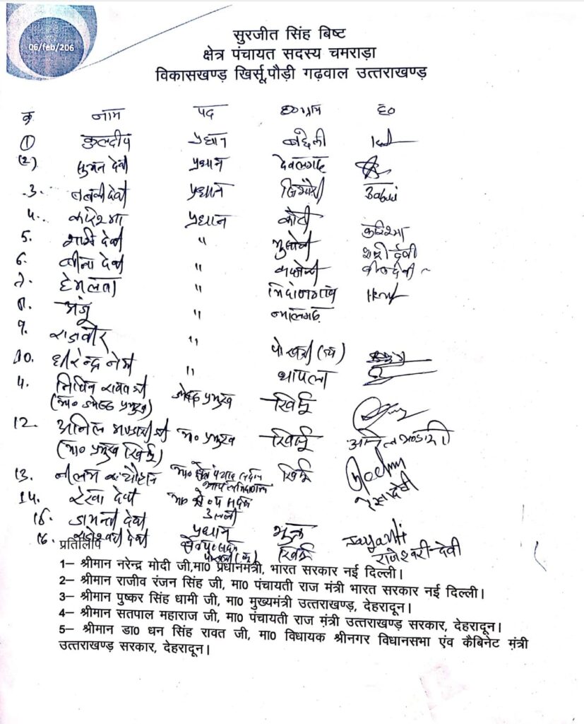 ज्ञापन सौंपने वालों में कुलदीप (प्रधान), सुमन देवी, बलवीर देवी, करिश्मा, नीलम चौहान और रेखा देवी सहित कई ग्राम प्रधान और क्षेत्र पंचायत प्रतिनिधि शामिल रहे।