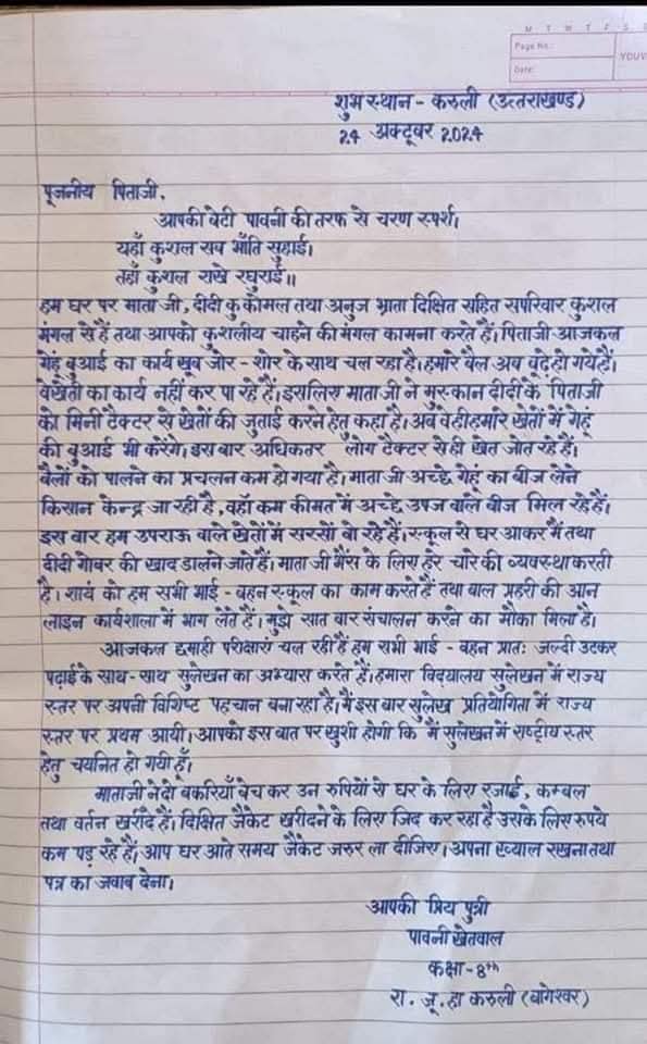 बागेश्वर जिले की पावनी खेतवाल, जो जूनियर हाईस्कूल करुली में कक्षा 8वीं की छात्रा हैं, ने एक बड़ी उपलब्धि दर्ज की है, उन्हें सुलेख प्रतियोगिता के राष्ट्रीय स्तर के लिए चयनित किया गया है।